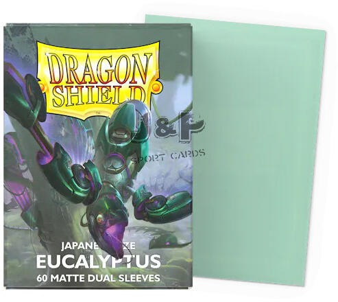 Eukaliptusz – nyugtató és tápláló. Japán méretű Dragon Shield Dual Matte kártyavédők. Átlátszó elülső rész és texturált, matt hátlap. Teljesen átlátszatlan tokok fekete belsővel – elegáns háttér a fekete szegélyű kártyák számára. 60 darabos dobozban érkezik. A masszív kartondoboz 40+ egyszeresen vagy 35+ duplán védett kártya tárolására alkalmas.