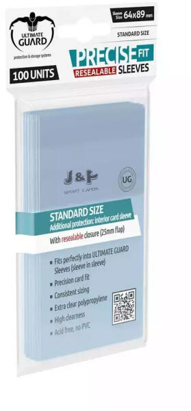 Visszazárható kártyavédő fólia. PRO-Fit kártyavédő fólia MTG és hasonló méretű kártyákhoz (max. kártya méret 63*88mm). Ezek a belső tokok szorosan illeszkednek a kártyára, így extra védelmet nyújtanak. A PRO-Fit önálló tokként is használható, ha a kártyát önmagában szeretnéd használni. A szabványos méretű PRO-Fit fóliák együtt használhatók más kemény tokokkal, például toploaderrel. Különösen akkor ajánlott, ha a kártyát várhatóan sokszor be- és kiveszik a kemény tokból. Nagyon tiszta, savmentes anyagból készült. 100 kártyavédő bugyi csomagonként. Gyártó termék oldala: Ultimate Guard Precise-Fit Sleeves Resealable Standard