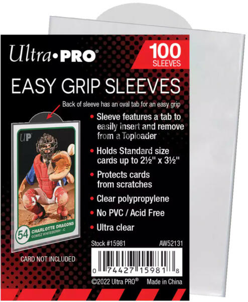 Bemutatjuk az Ultra PRO Easy Grip Sleeves-t, az első olyan káryavédő fóliánkat amely egy félkör alakú füllel rendelkezik. A toploaderben a kártya fölé nyúlik, így a legegyszerűbb módja annak, hogy kivegyünk egy kártyát a Toploaderből! A félkör alakú fül a kártyák behelyezését is segíti, azért hogy elkerülhesd a kártyasarkok sérülését. Az hagyományos kártyavédő fóliákhoz hasonlóan az Easy Grip Sleeves is PVC mentes, archiválásra alkalmas és savmentes polipropilén fóliából készül, amely megvédi az értékes kártyáidat a portól, szennyeződésektől és a kezedről származó természetes olajoktól a szortírozás során. A szabványos méretű (2½" X 3½") és legfeljebb 35pt-s vastagságú kártya védő fóliák minimálisra csökkentik a felületi karcolásokat a kártyákon válogatás, bemutatás vagy játékkártyák esetén játék közben.